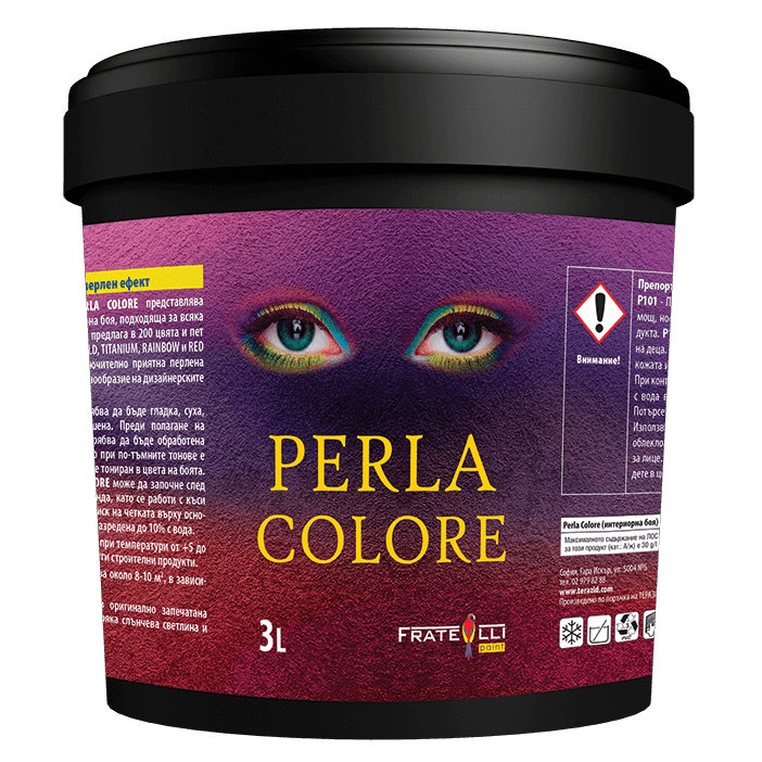 PERLA COLORE представлява висококачествена интериорна боя на акрилна основа, която се предлага в 200 цвята и 5 основни бази – SILVER, GOLD, TITANIUM, RAINBOW и RED GOLD. Със своята изключително нежна и елегантната визия, боята се нарежда на челно място сред предпочитаните продукти в сферата на интериорния дизайн. Богатата цветова гама и разнообразието от перлени отблясъци дават пълна свобода на въображенето и превръщат PERLA COLORE в идеалния финален щрих за всеки модерен дом.